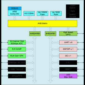 - Integration of a wealth of timers, communication interfaces (6 UART, 1 SPI, 1 I2C) and high-performance analog front-end processing modules, such as 12bit500KspsADC, multi-stage gain adjustable operational amplifiers and so on.