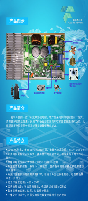 Our company developed a 1.5P inverter external machine electronic control, this product adopts the inverted buckle electronic control box design, has a good dustproof effect; using the industry's latest high-frequency PFC and external DC fan function, greatly improving the efficiency of the electronic control assembly and can effectively reduce the cost of the whole machine.