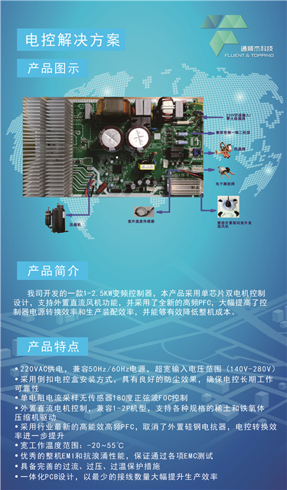 Our company developed a 1-2.5kw inverter controller, this product adopts single chip dual motor control design, supports external DC fan function, and adopts a new high-frequency PFC, which greatly improves the power conversion efficiency of the controller and the efficiency of the production equipment, and can effectively reduce the cost of the whole machine.